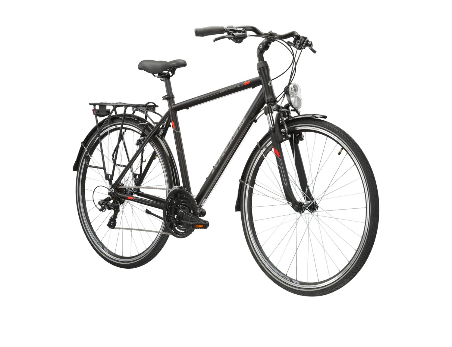 Dzięki zastosowaniu napędu z 21 przełożeniami, KROSS Explorer 1.0 zapewnia komfortową jazdę w zróżnicowanych warunkach terenowych. Tylna przerzutka z grupy Tourney to gwarancja płynnej zmiany biegów, co pozwoli na efektywne pokonywanie dłuższych dystansów bez uczucia dyskomfortu.