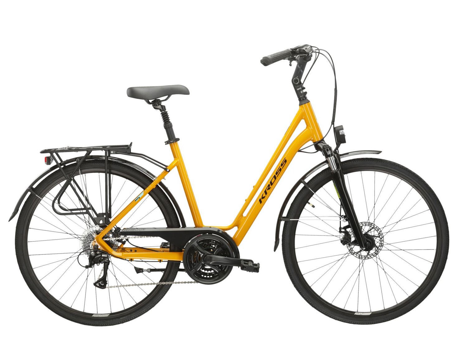KROSS Sentio 3.0 to nie tylko solidny rower, ale również bardzo praktyczny. Zintegrowane oświetlenie poprawia widoczność po zmroku, a wysokiej jakości siodło, osadzone na amortyzowanej sztycy, zapewnia komfort nawet podczas długich tras. Amortyzowany widelec SR Suntour ze skokiem 50 mm sprawia, że jazda po nierównościach staje się przyjemnością, a nie udręką.